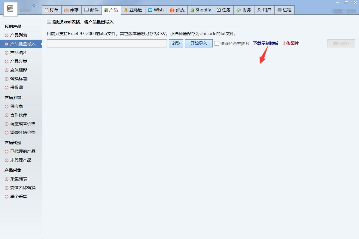 1、打開產(chǎn)品——產(chǎn)品批量導入,然后下載示例模板。