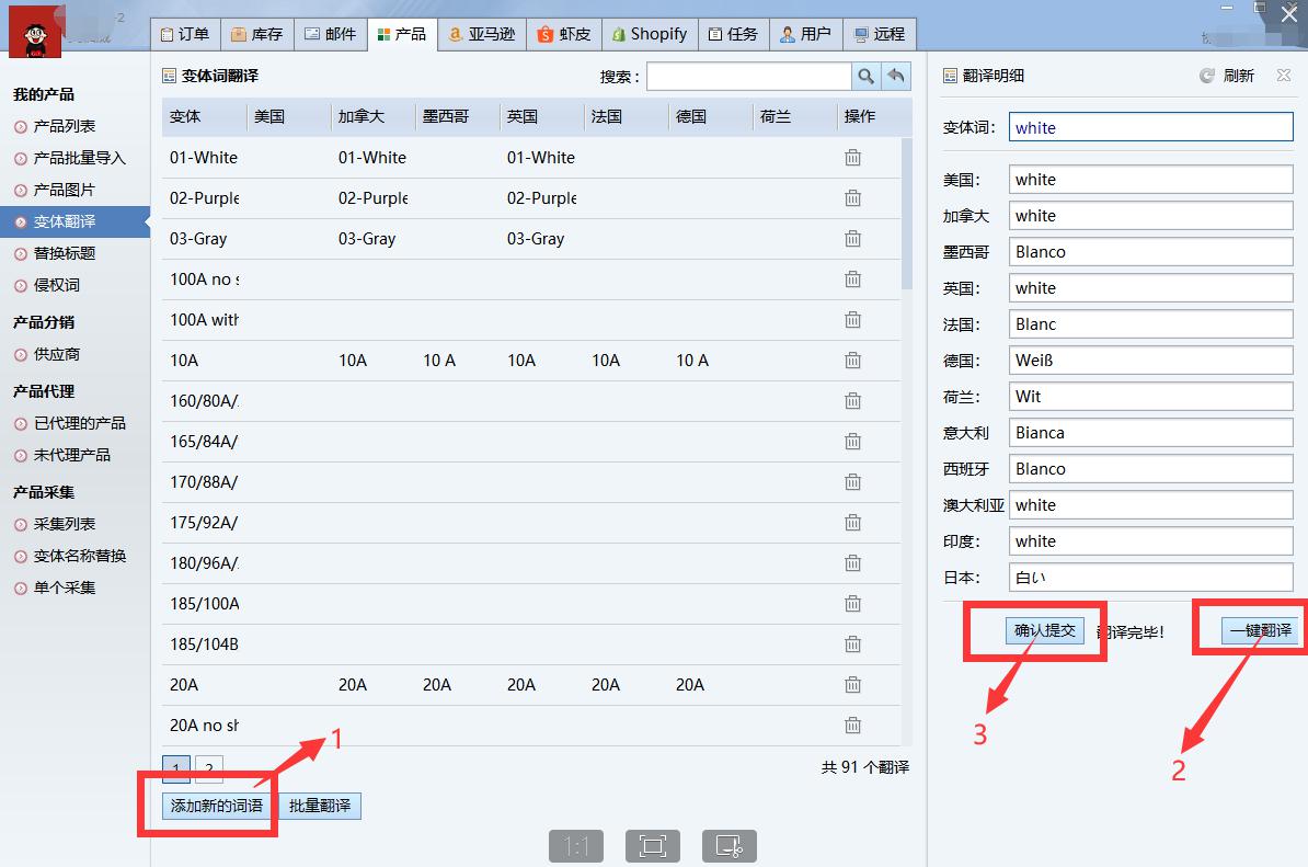 打開(kāi)產(chǎn)品——變體翻譯,點(diǎn)擊“添加新的詞語(yǔ)”輸入變體詞,點(diǎn)擊“一鍵翻譯”,就能看到各個(gè)國(guó)家屬性詞的語(yǔ)言,點(diǎn)擊確認(rèn)提交,這個(gè)屬性詞的各國(guó)語(yǔ)言就會(huì)在變體詞庫(kù)里。
